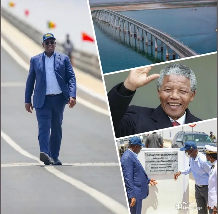 C’est le plus grand pont jamais construit au Sénégal. Érigé sur un linéaire de 1600 mètres, le pont à péage relie directement les localités de NDakhonga et Foundiougne. L’infrastructure va désenclaver le département de Foundiougne. Ce pont était attendu depuis longtemps par les opérateurs économiques de la région centre du Sénégal. Désormais, ils pourront même rallier la Gambie et le sud du pays sans passer par la région de Kaolack, qui constituait un long détour. ‘’J’ai décidé de donner le nom du pont à péage de Foundiougne à Nelson Mandela, un illustre fils d’Afrique, non seulement en tant que président de l’Union Africaine, mais aussi au nom de l’amitié des peuples.’’, a-annoncé le Chef de l’Etat, lors d’un discours prononcé à l’inauguration de l’infrastructure. « Ce pont de Foundiougne mérite d’avoir un parrain à la hauteur de l’ouvrage. C’est pourquoi considérant l’amitié entre les peuples d’Afrique, j’ai décidé de donner le nom à l’un des plus illustres fils du continent, le Président Nelson Mandela. Ainsi, le pont de Foundiougne devient le pont Nelson Mandela ou bien Nelson Mandela bridge », a-t-il laissé entendre.